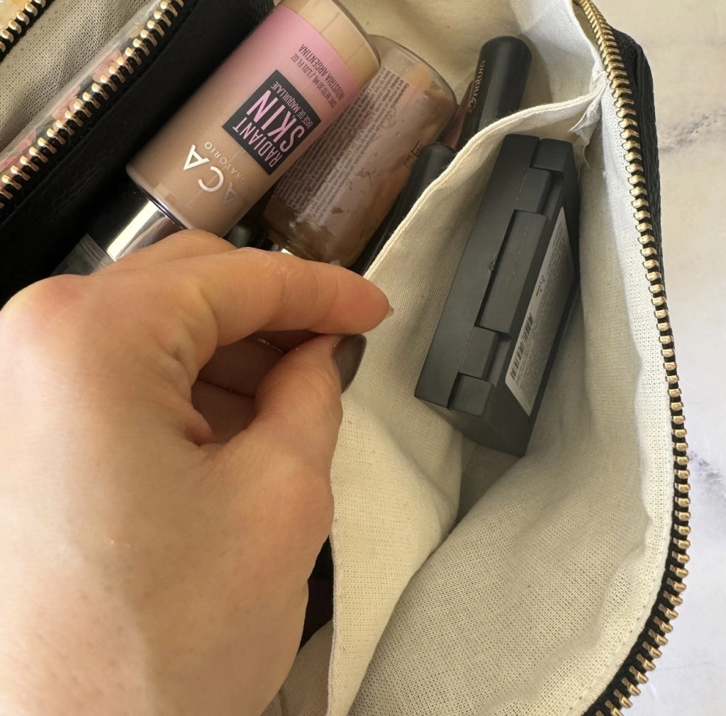 Por dentro tiene un bolso interno divisor con cierre para puedas guardar los productos más pequeños tales como medicamentos, pinza de depilar, sacapuntas, delineador retráctil, etc.