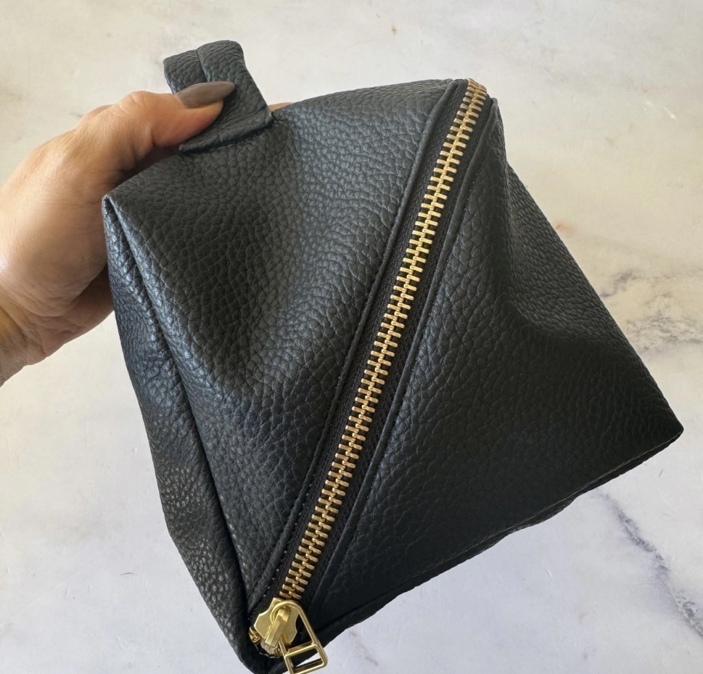 Bolso de ecocuero de amplia capacidad y ultra compacto ya que posee cierre diagonal que hace que duplique su tamaño. Fijate que logré guardar hasta una botella de 250ml y aún hay espacio para más!
