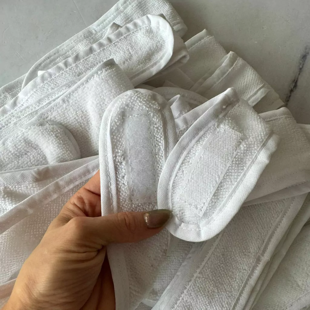 Vincha de toalla blanca o fucsia con abrojo.