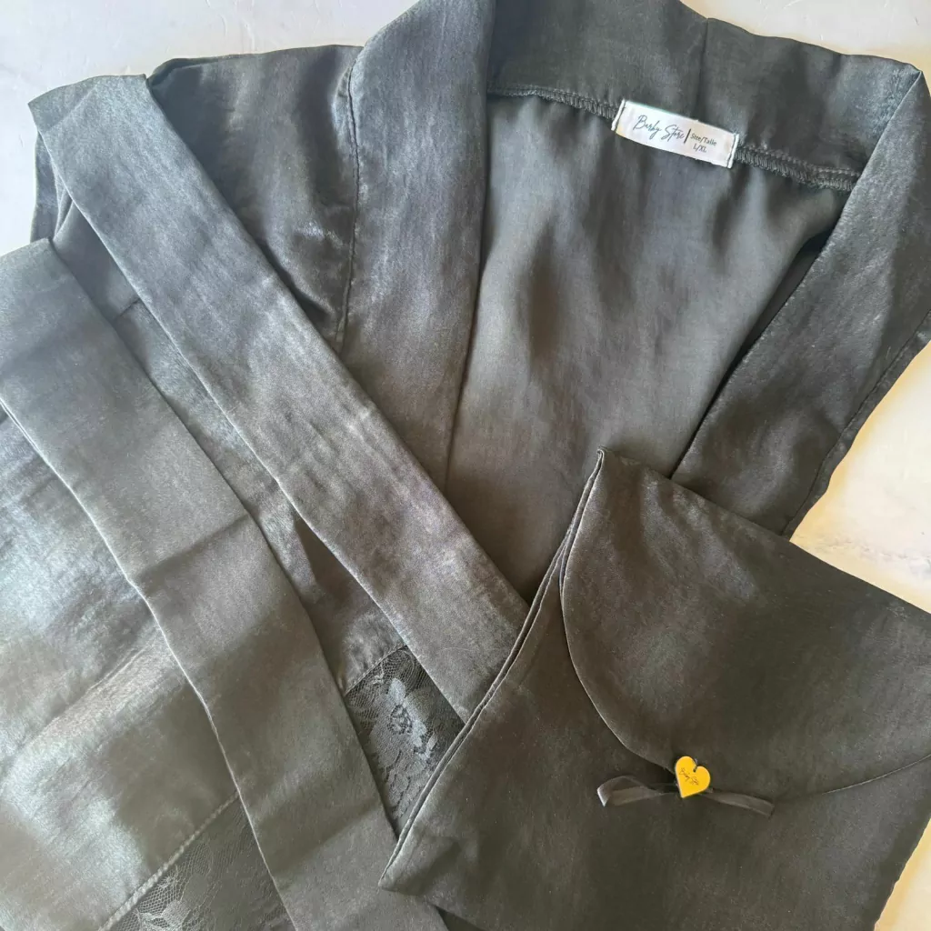 Me siento feliz de presentarles esta Bata confeccionada con satén y detalles con puntilla de encaje en sus mangas.